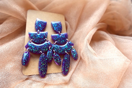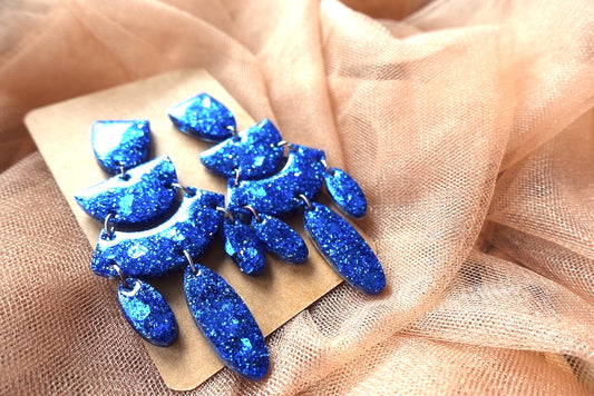 Lange donkerblauwe glitter oorbellen - statement oorbellen