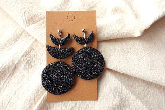 Halve maantjes zwarte oorbellen met holografische glitter - statement oorbellen
