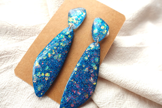 Blauwe holografische glitter oorbellen met flakes - statement oorbellen (libelle)