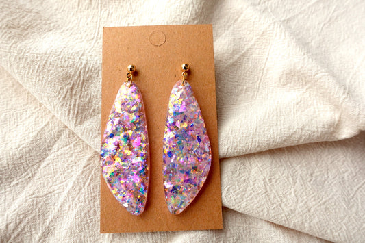 Lichtroze holografische glitter oorbellen met knopje en flakes- statement oorbellen (libelle)