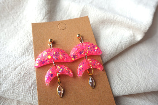 Halve maantjes roze oorbellen met goudkleurige glitter - statement oorbellen