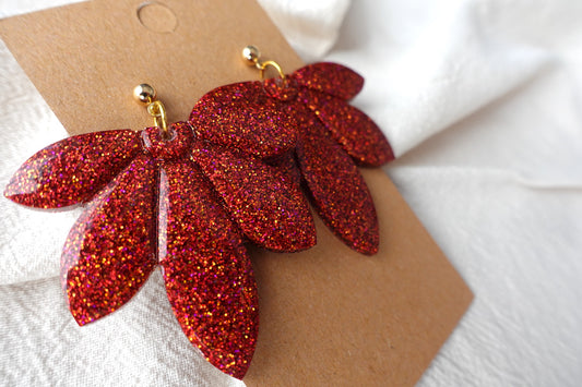 Bloem rode oorbellen met holografische glitter - statement oorbellen