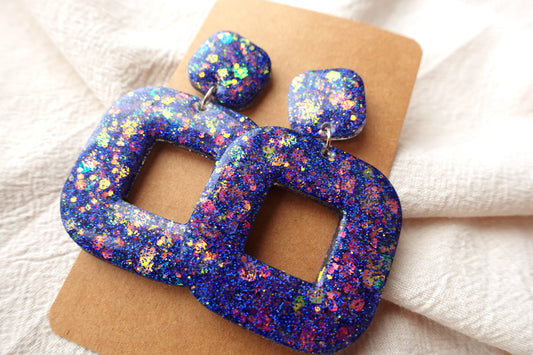 Vierkante donut oorbellen donkerblauwe glitter holografische oorbellen - statement oorbellen