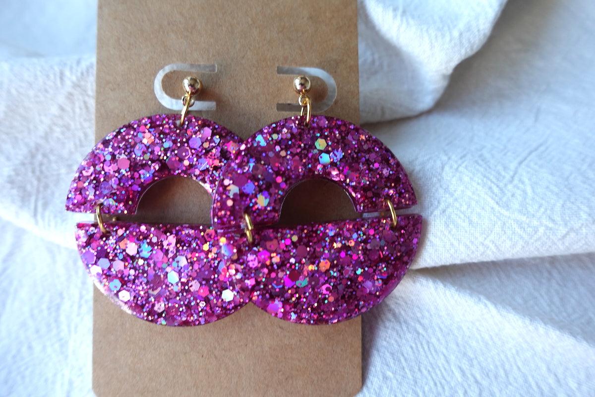 Halve maan fuchsia holografische oorbellen met glitter - statement oorbellen